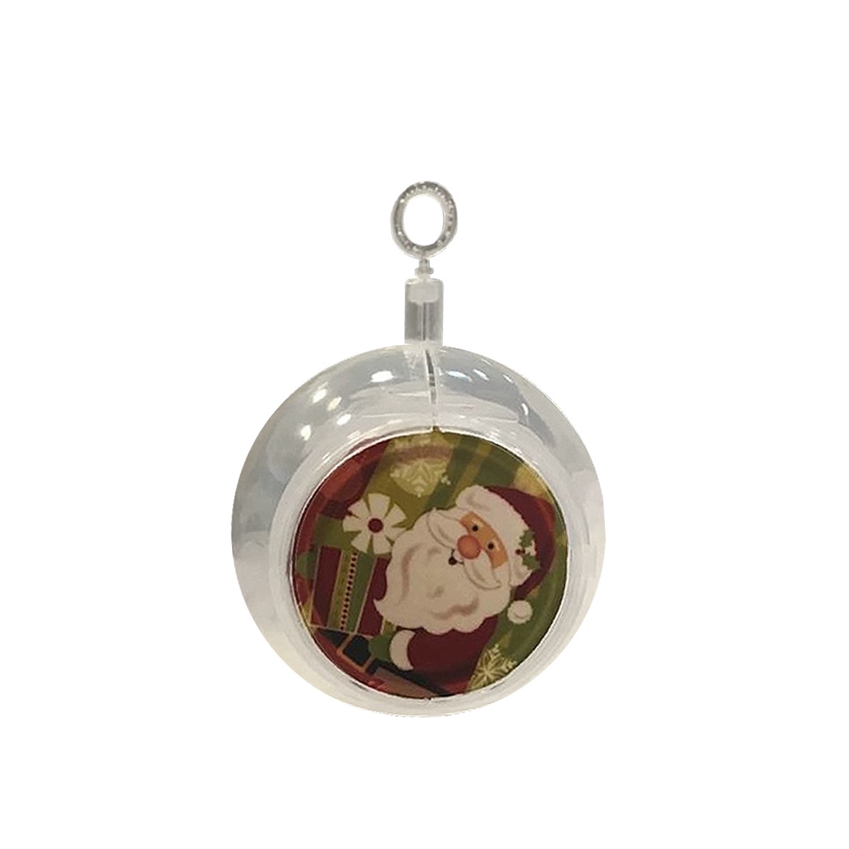 Bola navideña divisible con centro sublimable blanco y exterior transparente. Diseñada para sublimación térmica con acabado brillante y colores fotográficos que resisten rayaduras.