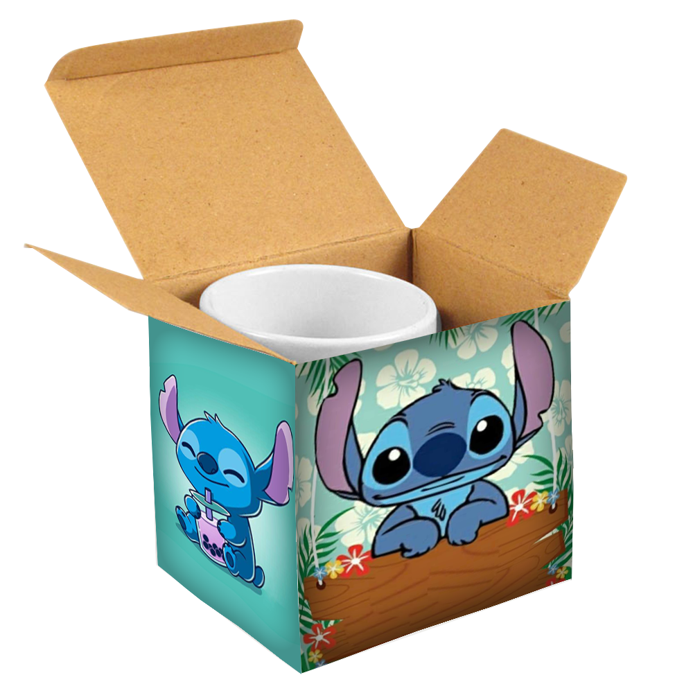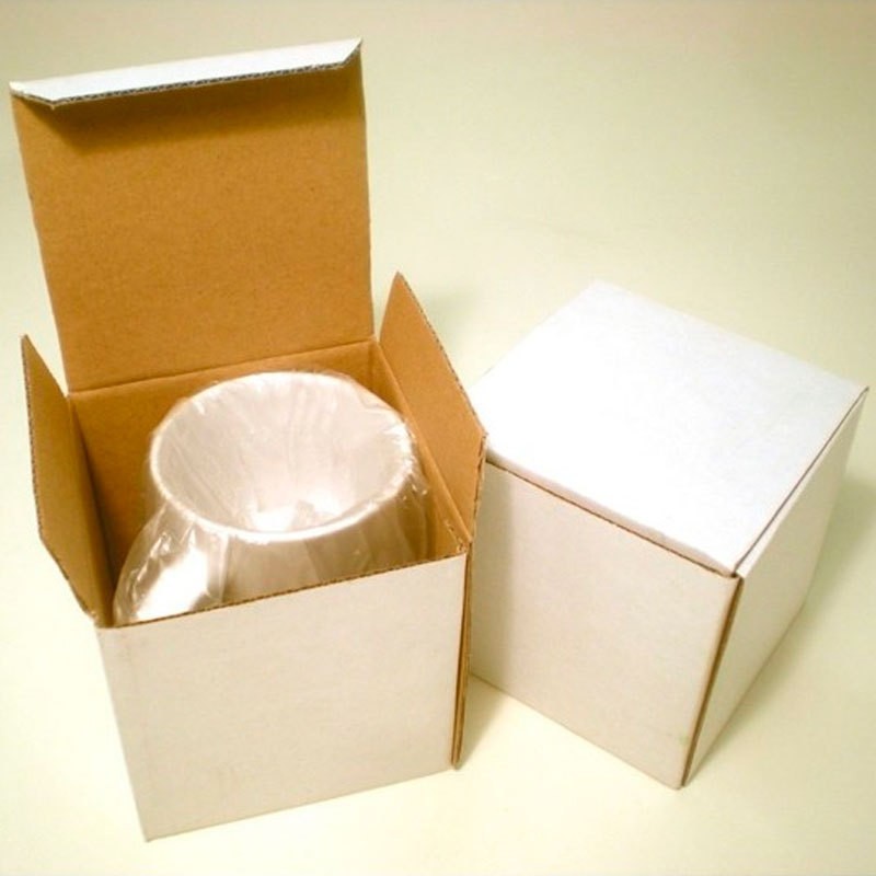 Caja blanca de cartón diseñada para sublimar y personalizar tazas. Corte nuevo que optimiza el embalaje de productos sublimados, lista para aplicar diseños a 180-190°C en 60 segundos.