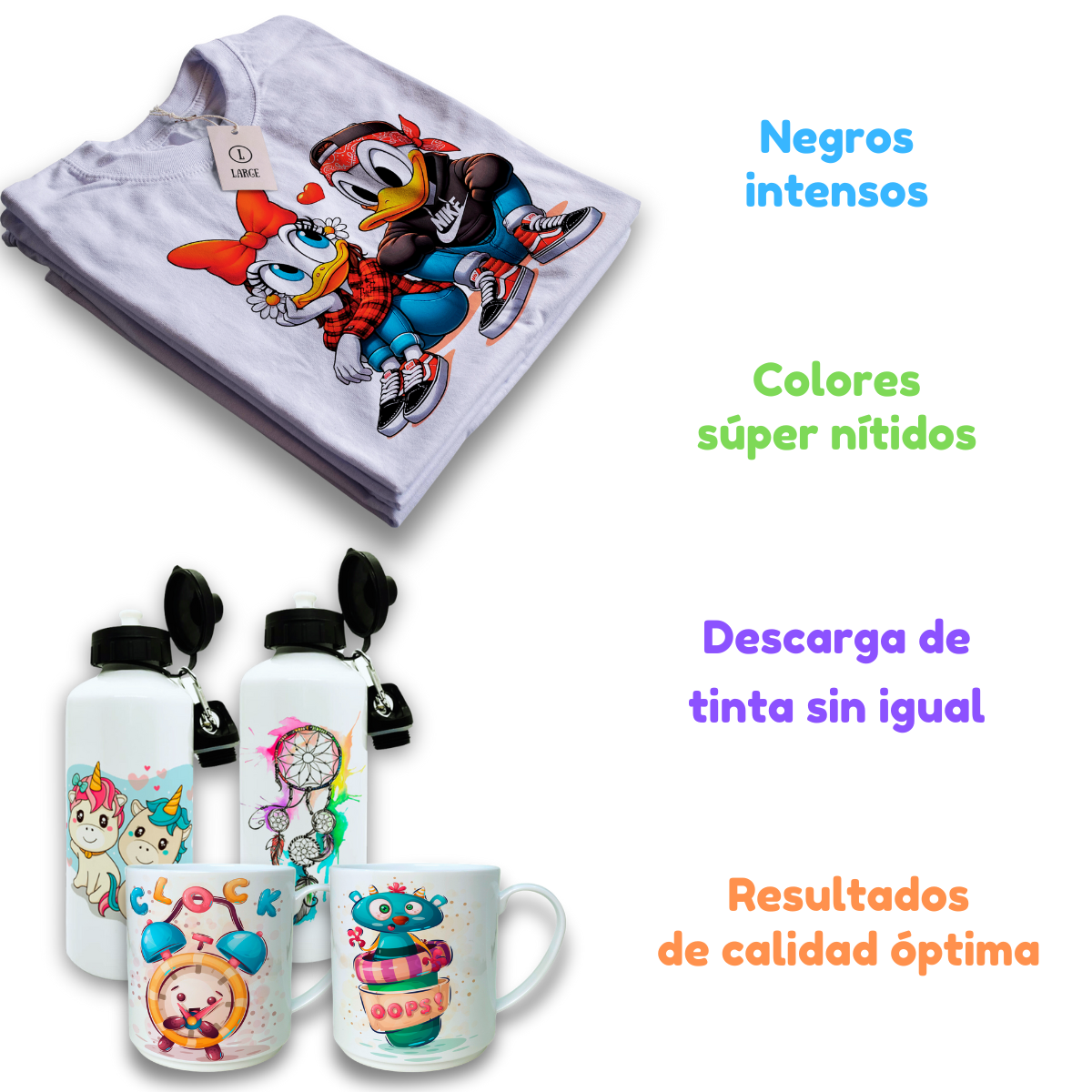 Kit completo para iniciar producción de remeras y textiles sublimados. Incluye estampadora plana digital, impresora multifunción con sistema continuo, tintas, papel y cinta térmica.