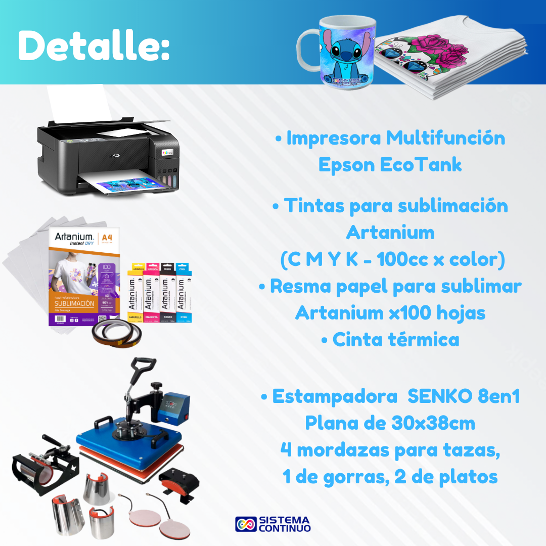 Kit completo para iniciar producción de sublimación en textiles y artículos. Incluye estampadora plana con 8 resistencias intercambiables, impresora multifunción Epson con sistema continuo, y insumos listos para usar.