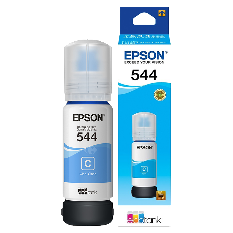 Tinta fotográfica original Epson de alta densidad de color para impresoras de sistema continuo L3110, L3210, L3250 y L3150. Disponible en los cuatro colores: Amarillo (T544A), Negro (T544BK), Cian (T544C) y Magenta (T544M).
